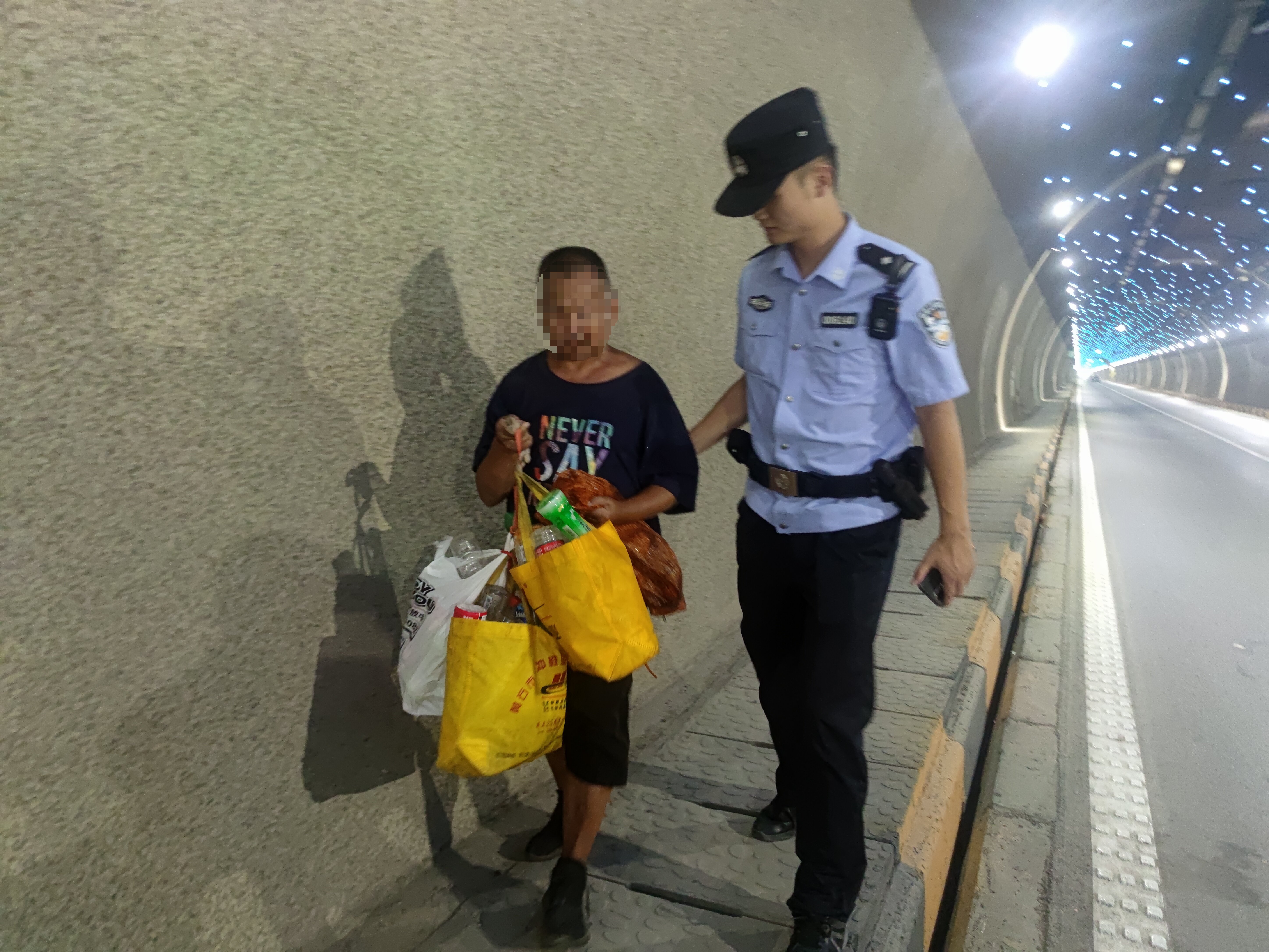 接警后,值班民警陈宇和辅警火速驱车赶往现场,沿着隧道一路仔细搜寻,终于在汪仁镇往黄石方向的隧道内找到了正在机动车道上逆行的男子,男子身上背着几袋装有塑料瓶的袋子。由于隧道内光线较暗,过往车辆车速快,情况危急,民警立即停车上前将男子带离危险区域