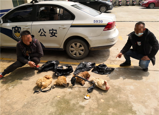 在现场,民警见到许多群众已将2名中年男子团团围住,在他们的身旁放着受伤的鸡和(屯鸟)。民警立即将2人带回派出所调查。