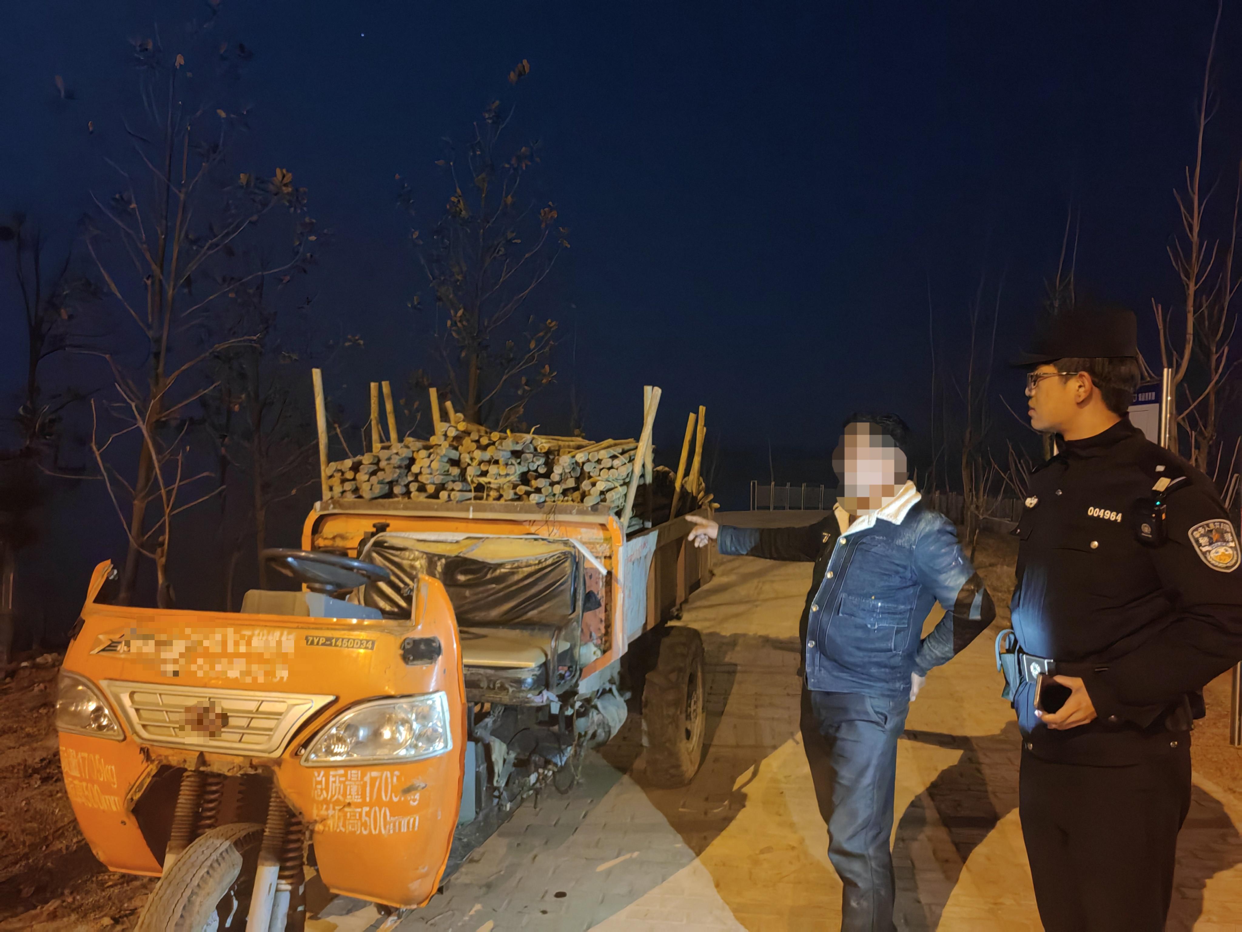 当晚10时许,冯师傅同往常一样在工地巡逻,发现堆放在绿化带附近的苗木支撑杆相较平日里少了许多。察觉情况不对劲,他便与同事一同在工地附近寻找,发现工地新刷的水泥路有车辆的压痕。沿着车轮查看,他们发现有一对男女正将木头往电动三轮车上装,立即上前将两人抓获,并第一时间报警求助。
