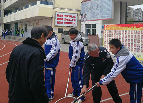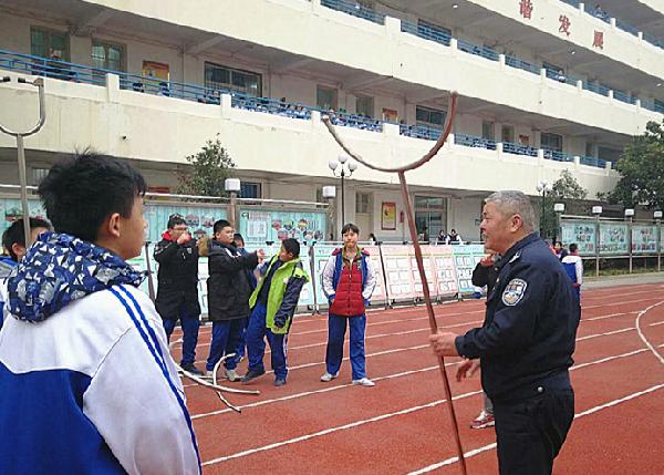 此次演练采取“模拟场景实战演练”的方式,社区民警徐兴跃通过模拟与歹徒的对抗,向广大师生讲解了在遇到歹徒时如何利用身边的物品进行自卫,并现场对校园安保中经常使用的钢叉、警棍等器械使用方法做了详细讲解和示范。