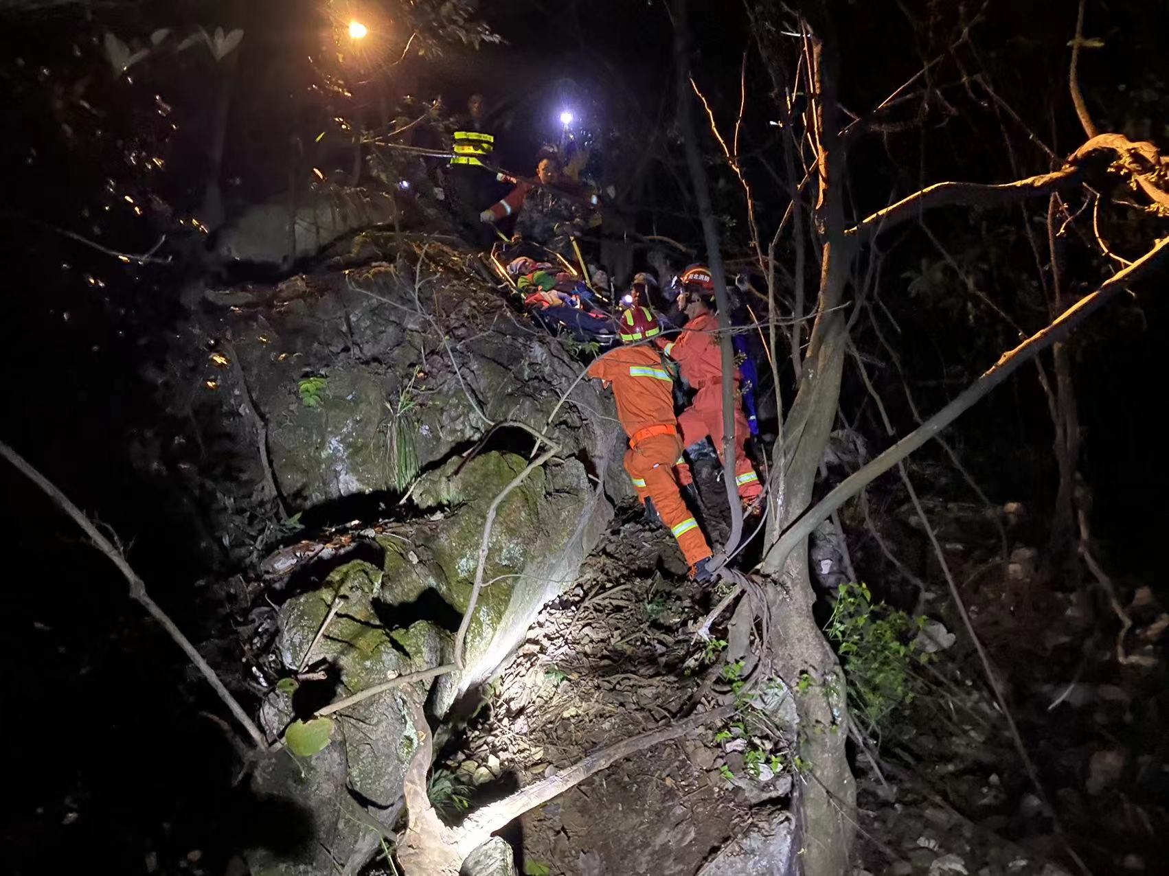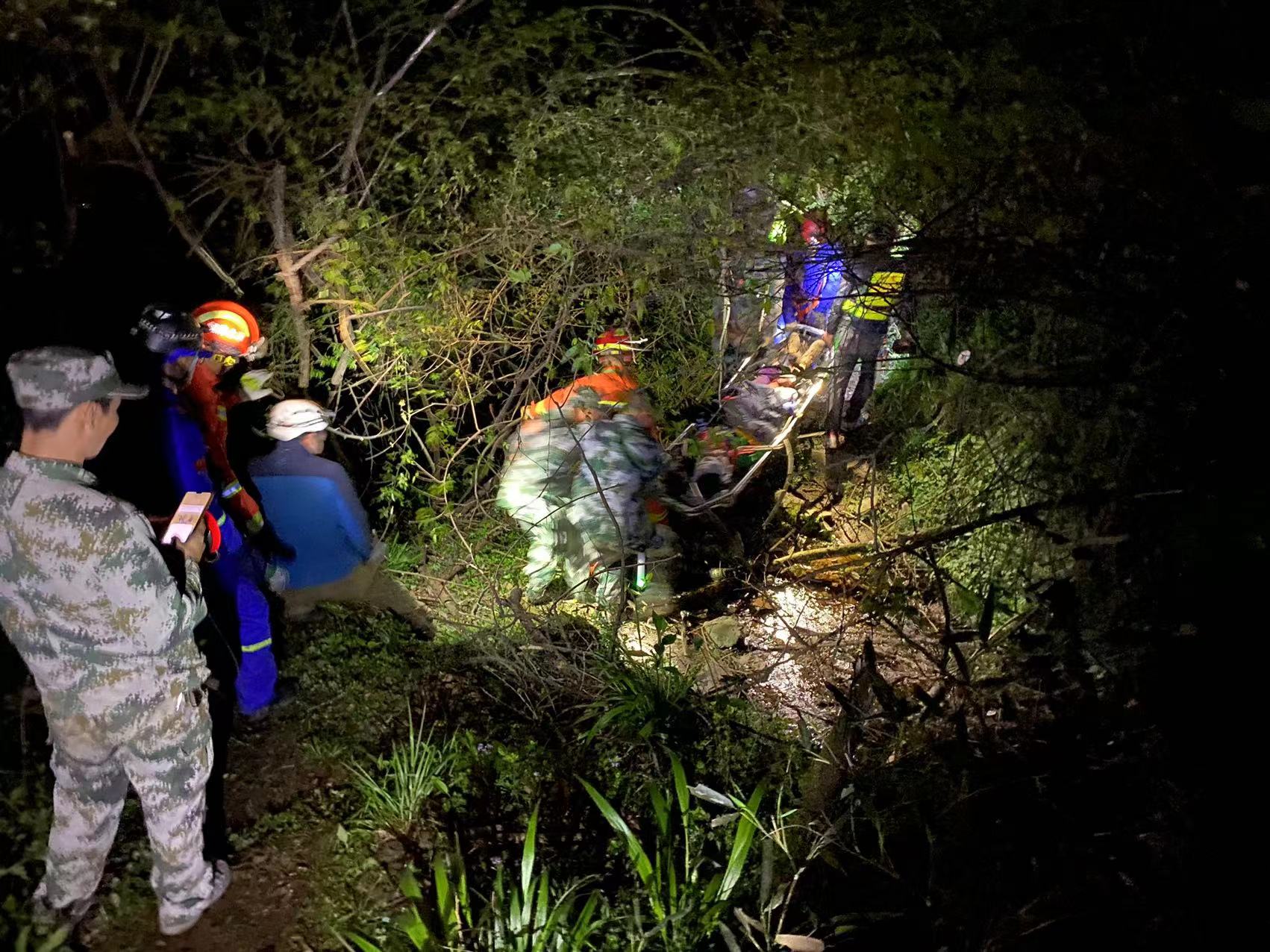 陡峭的悬崖、茂密的丛林,救援人员的身影穿梭在狭窄的山路间,仿佛一道光照亮了漆黑的夜晚。经过9个多小时的搜寻,凌晨5时许,救援人员在父子山官山村方向的丛林间,先后找到了被困及受伤的12名人员,救援人员将携带的食物递给他们充饥,并查看伤情。