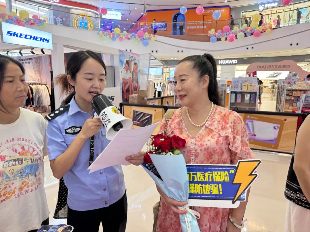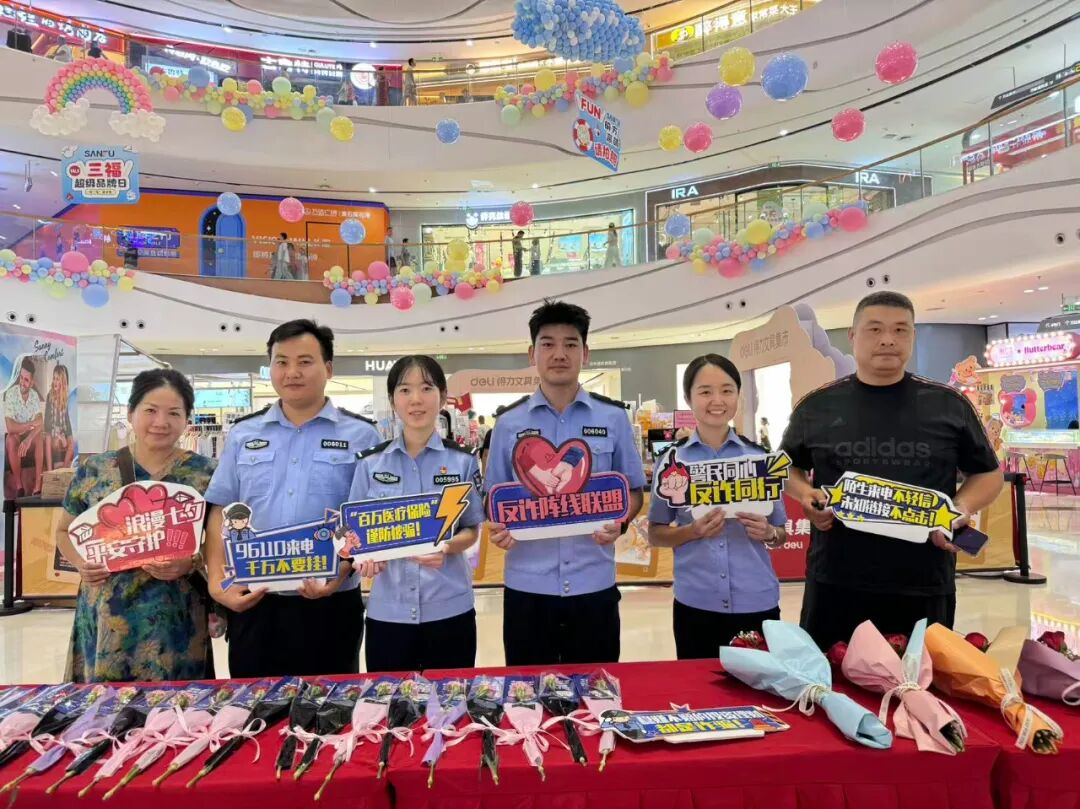黄石港区分局“青盾先锋团”在万达广场开展赠送“反诈鲜花”宣防活动