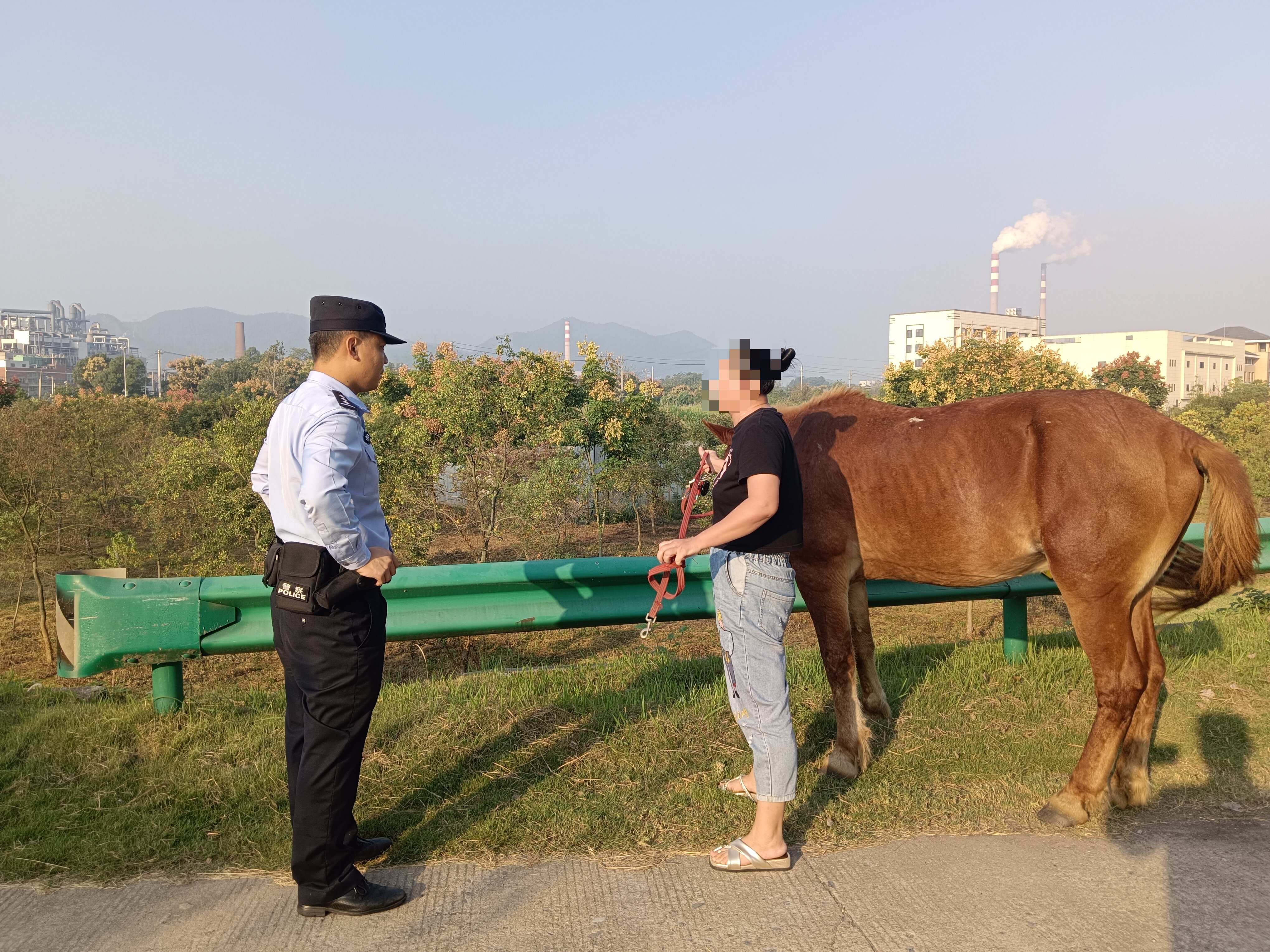 接警后,值班民警和辅警立即驱车赶到现场。只见马匹正在马路边踱步、低头吃草,时不时还横穿马路,极易造成道路交通事故。