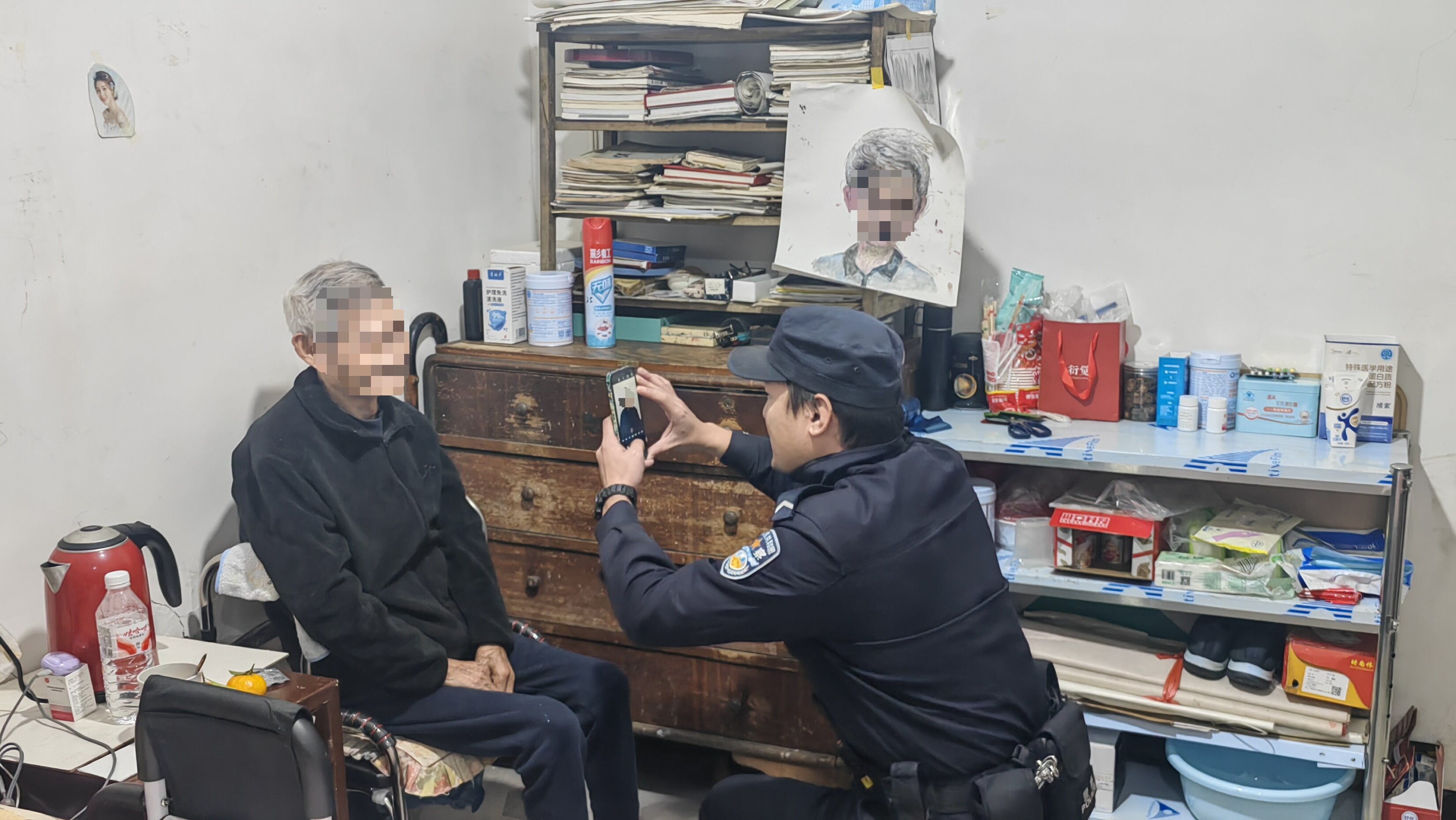 11月17日上午9时,民警李旋和辅警吕天赐携带采集设备,按约定的时间来到王女士家中,为其父亲王爹爹办理身份证件,考虑到老人行动不便,民警核对完老人的身份信息后,让老人坐在客厅的椅子上,以身后的白墙为背景为老人拍摄照片。