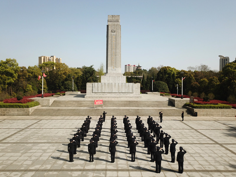 在鄂东南革命烈士陵园的革命烈士纪念碑前,民警们整齐列队,怀着崇敬的心情敬献花圈,集体脱帽默哀,追忆英烈们舍生取义的崇高品德,并重温入党誓词,牢记初心使命。