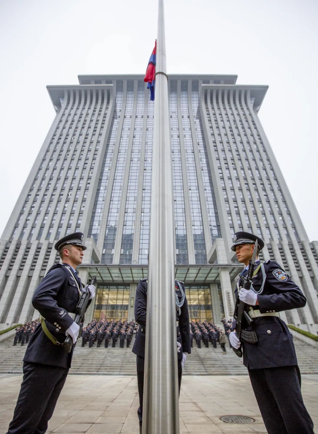 “升警旗,奏警歌!”1月10日上午9时整,黄石市公安局业务技术大楼门前,在刚劲有力的歌声中,红蓝相间、警徽熠熠的警旗在护旗手的拉动下,在现场民警的注目中,缓缓升起。