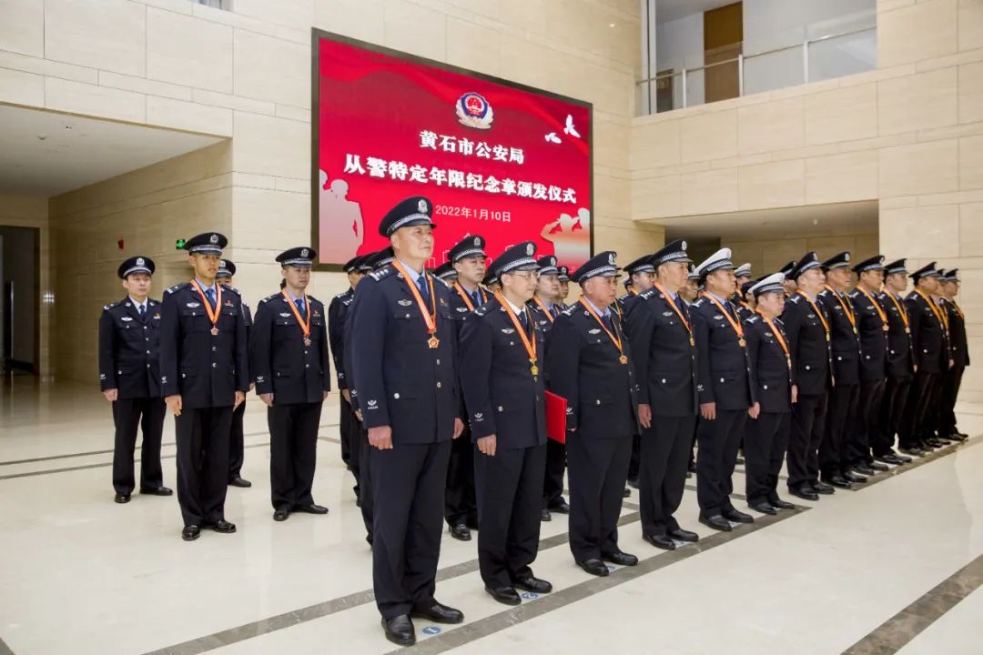 当日上午,黄石市公安局举行从警特定年限纪念仪式,集中向41名在公安战线奋斗10年、20年、30年、40年的同志颁发纪念章,传承当先精神、凝聚奋斗力量,激励全体民警奋进新时代、护航新征程。