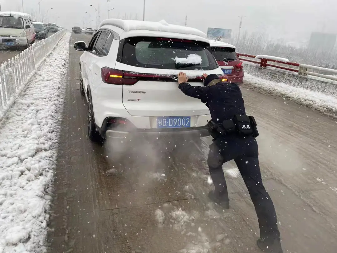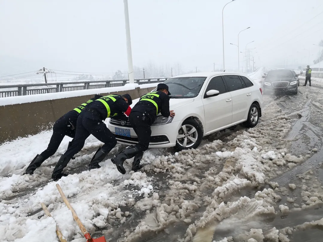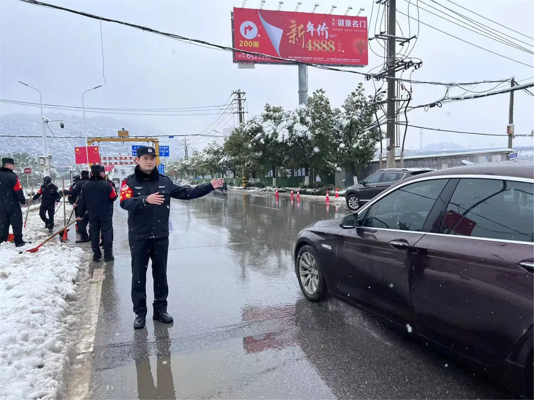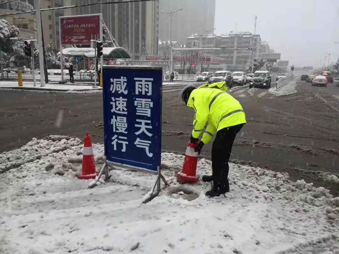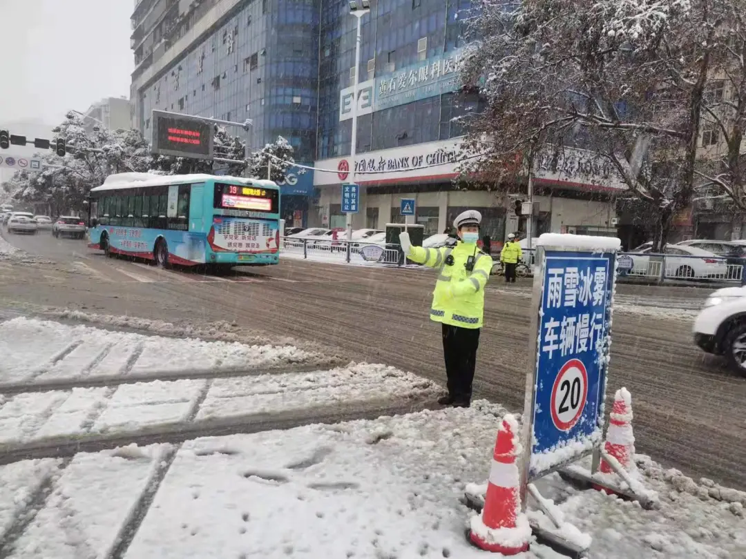 上路疏导行人和车辆,全力以赴确保道路交通安全畅通,适时向过往车辆驾驶员讲解降雪天气安全行车方法,同时利用手机短信、微信、微博等,编发各类提示性、告知性交通安全和天气预警信息,提醒大家注意交通安全。