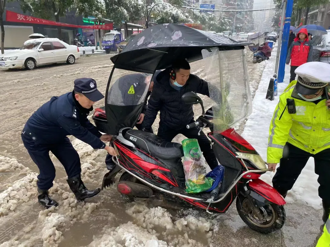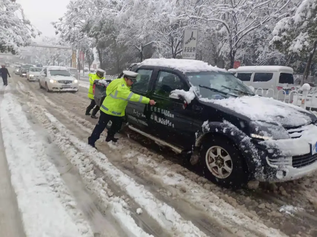 大冶公安以雪为令,迅速出击,民警们分赴各地清扫积雪,清理路面上被雪压断的树枝,帮助打滑车辆推车。
