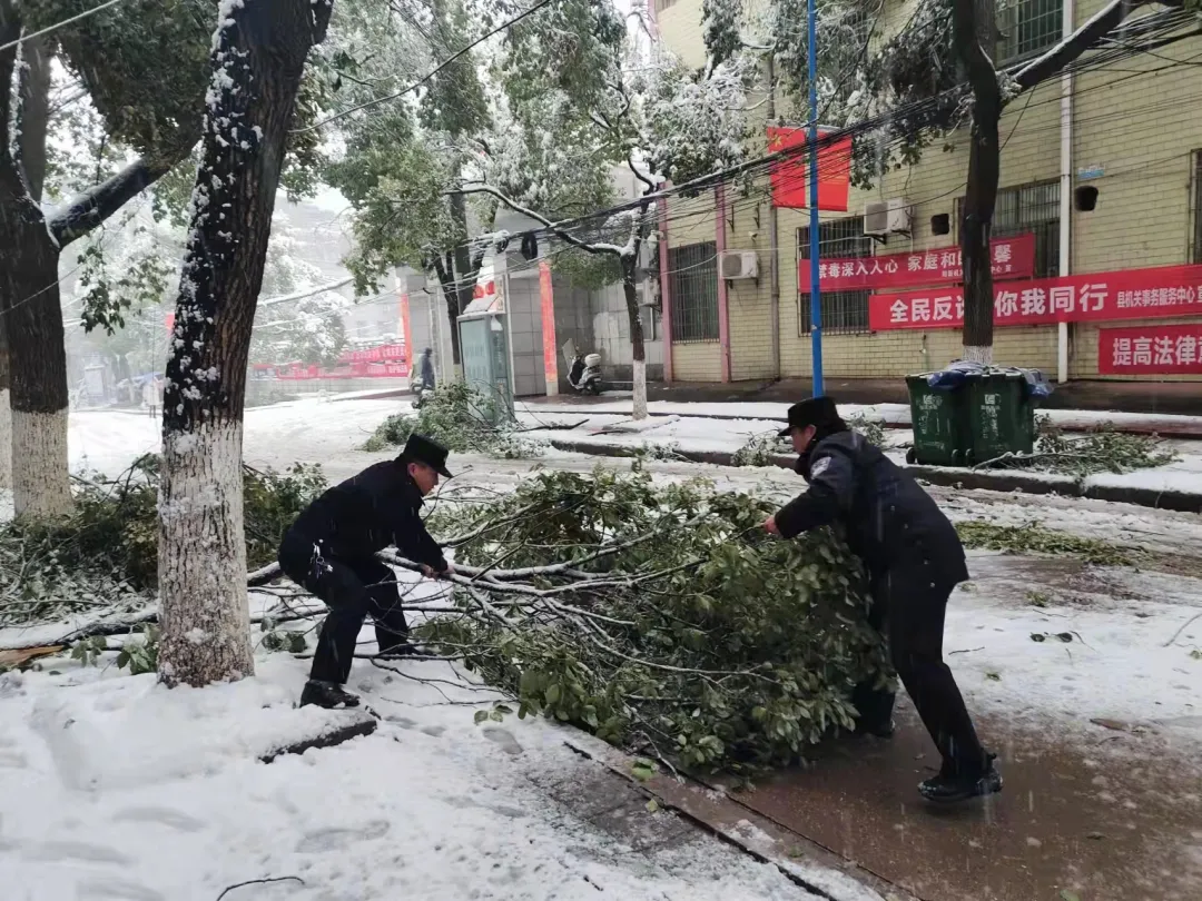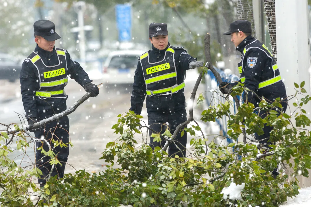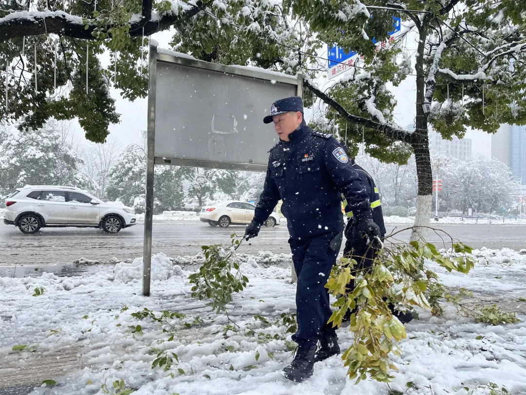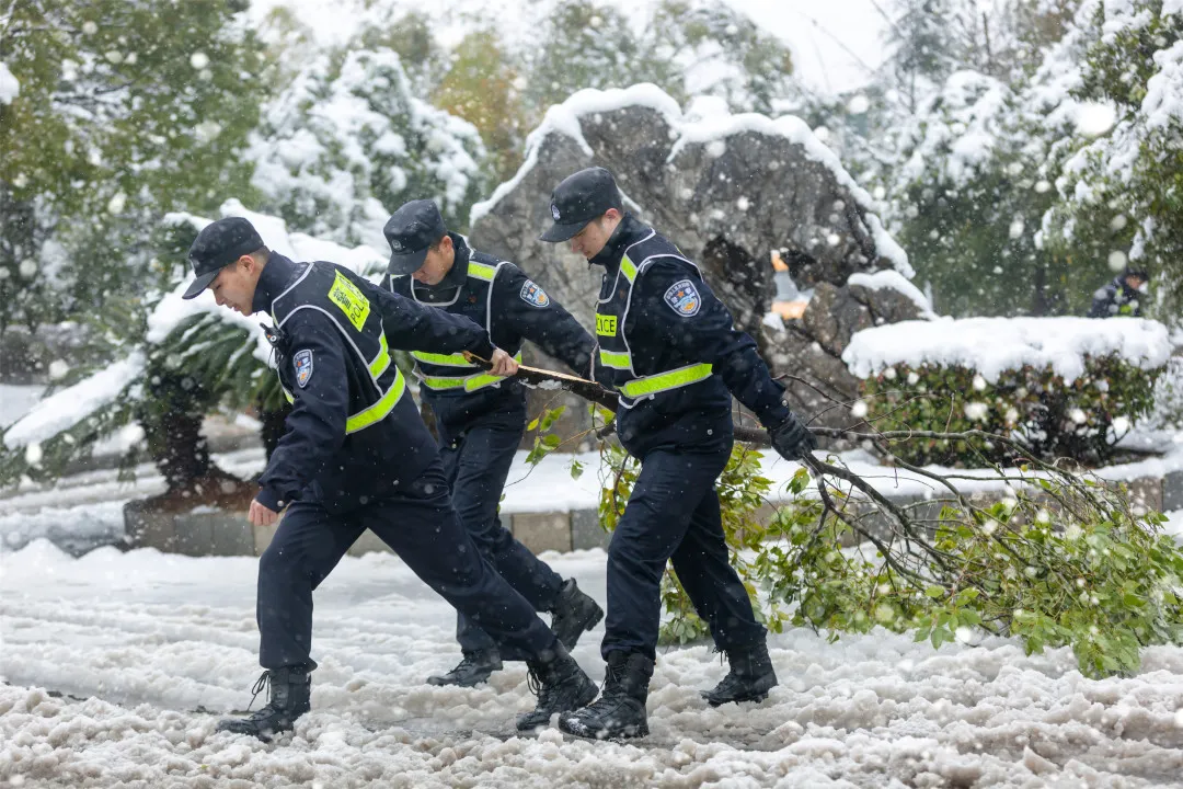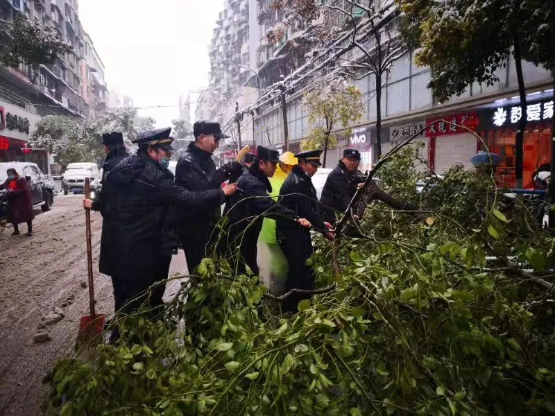 市公安局特警支队也安排突击队员,到杭州东路清理被积雪压断的树枝,清扫路面积雪,确保道路通畅。