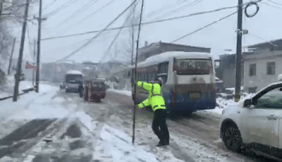 雪地湿滑,车辆行驶困难不断。7日早上8时许,开发区•铁山区公安分局大王派出所民警吕召栋在乘车前往大王镇315省道巷口村路段时,发现前方上坡路段,因路面积雪较厚,有七八辆车受困,无法前行。吕召栋立即下车冒雪帮助推车,周边村民见此一起加入,经过50多分钟的共同努力,所有车辆顺利上坡。