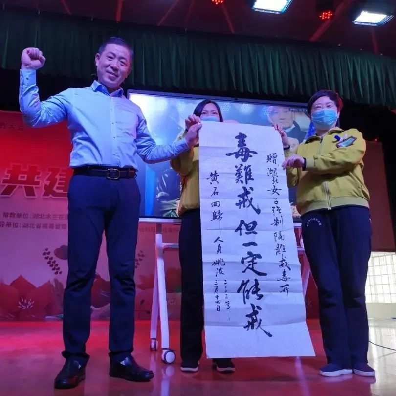 省女所为姚波颁发了同伴教育辅导员聘书,姚波向女所回赠了一幅“毒难戒但一定能戒”的书法作品。