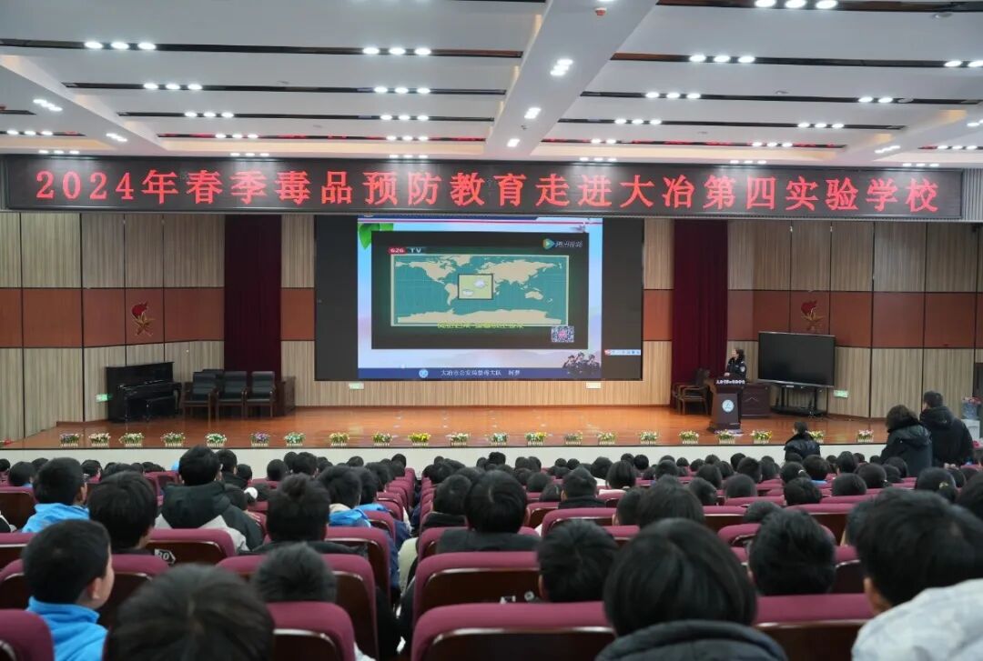 2月27日上午,大冶市公安局联合大冶市检察院走进大冶市第四实验学校,禁毒宣讲员通过PPT、有奖问答、播放禁毒宣传视频、典型案例分析、展示仿真毒品等方式,讲述毒品的种类、毒品犯罪、毒品危害以及如何预防等知识,教育同学们不要接受陌生人递来的任何物品,要慎重交友,绝不以身试毒,保持积极健康的生活态度和生活方式,自觉抵御毒品侵蚀。