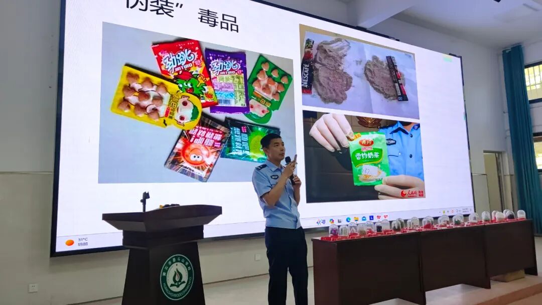 “同学们,谁知道毒品都有哪些?吸毒会给人带来怎样可怕的变化呢?大家看看这个‘糖果、饼干’,有认识的吗?”在大礼堂里,禁毒大队民警游侠通过展示PPT的形式,用简洁有趣的语言向同学们详细讲解了传统毒品、新型合成毒品的种类、特点以及危害,将禁毒工作的经验与一个个真实的案例结合,以案释法、以法论事,进一步引导同学们要认清毒品危害,树立自我保护意识。