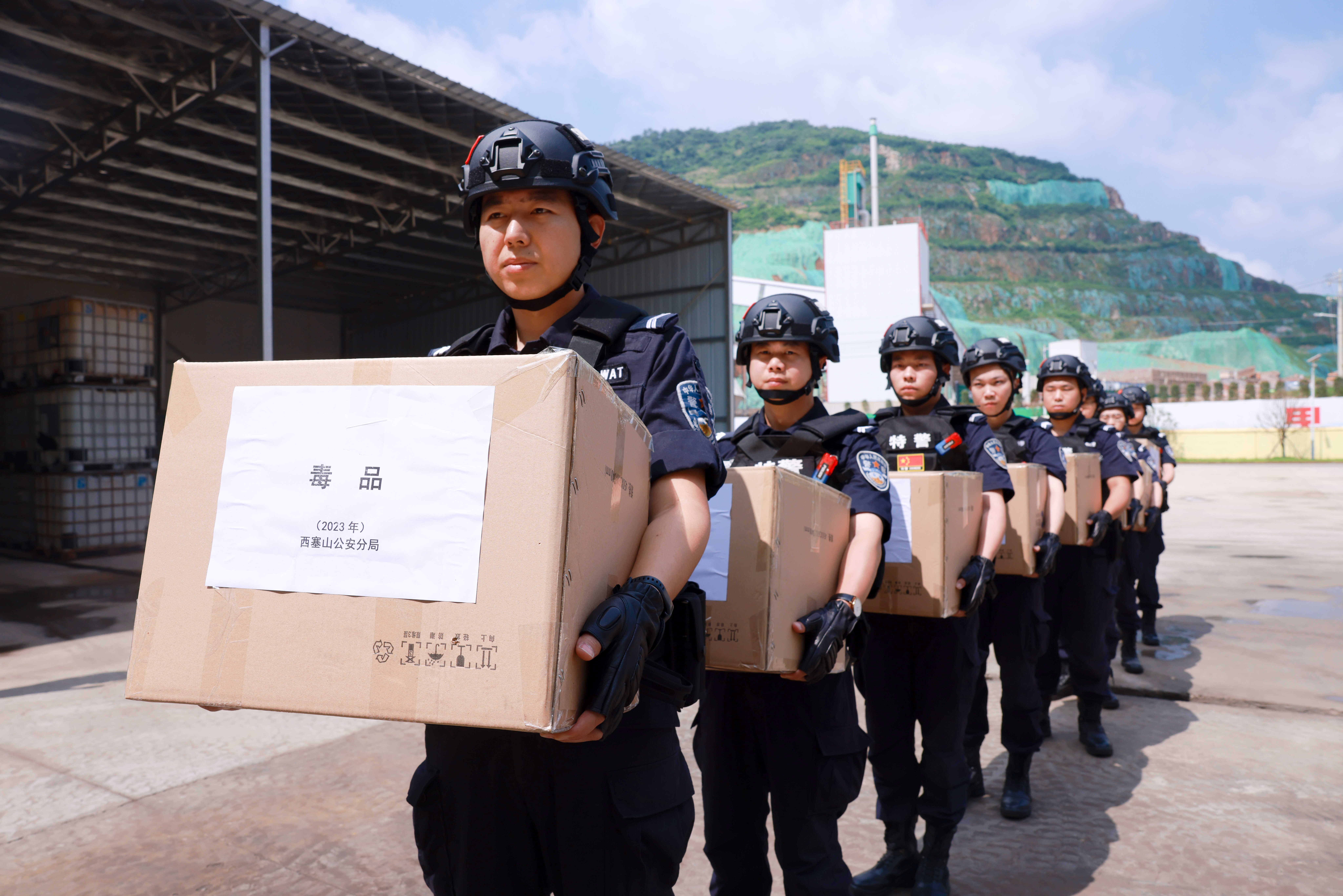 10只纸箱的毒品一字排开