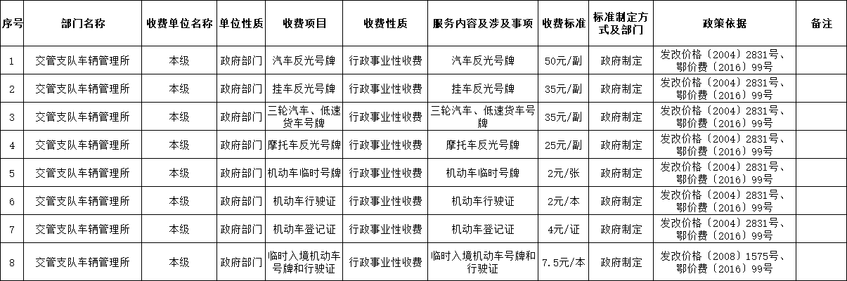 交通管理支队车辆管理所综合性涉企收费目录清单