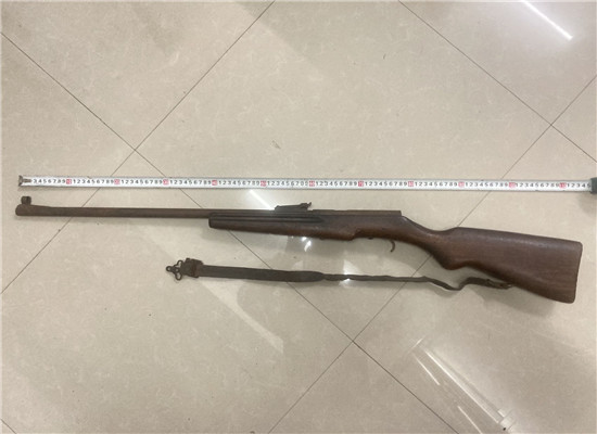 接到报警电话后,民警立即赶到张女士父亲家中,在张女士的指引下现场发现自制猎枪一支。枪支木质部分长约75厘米,金属部分长约80厘米,枪支总长度约113厘米。