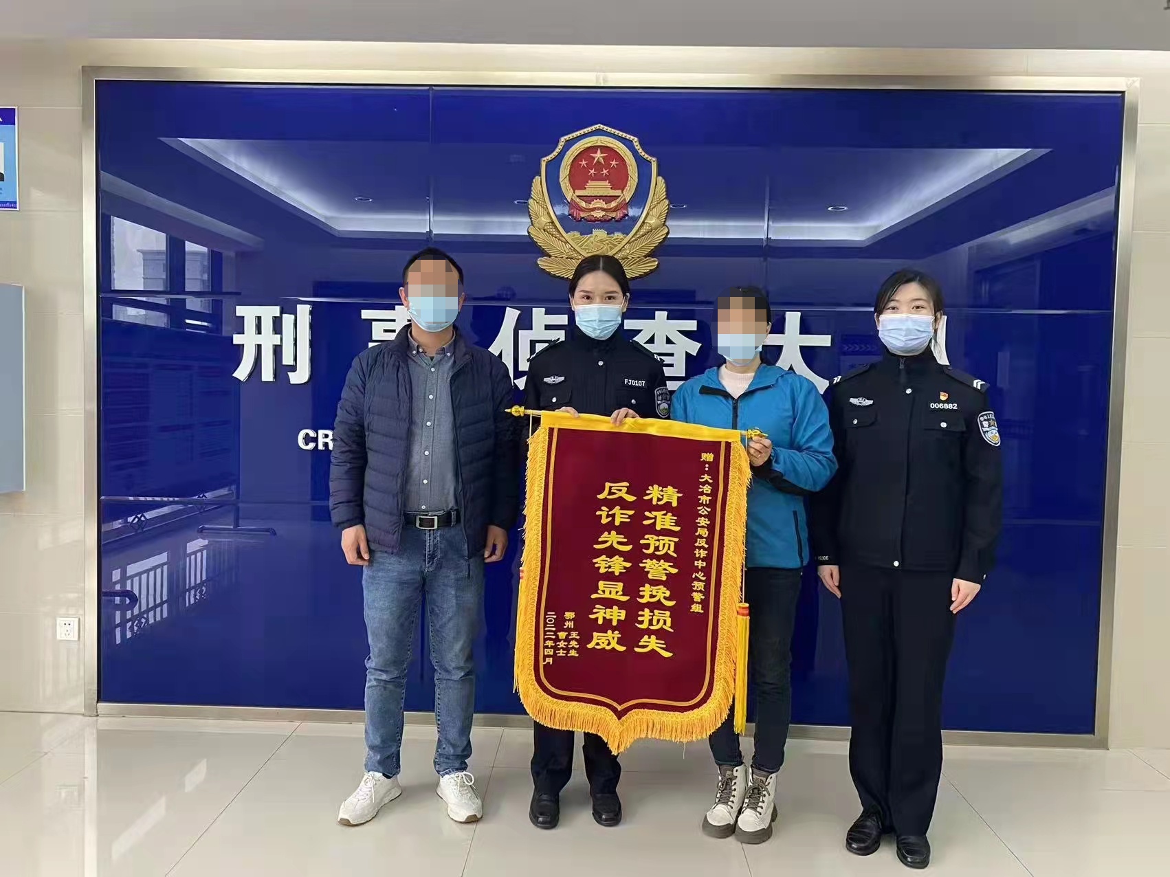 3月30日上午,大冶市民曹女士和爱人将一面锦旗送到大冶市公安局反诈中心,感谢反诈中心民辅警及时劝阻,为她挽回6万余元。