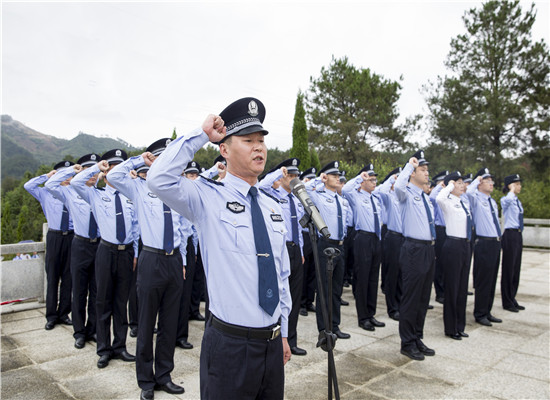 蒙蒙细雨中,鄂东南红军烈士纪念碑巍然耸立。民警代表列队肃立,高唱国歌,礼兵代表敬献花篮后,集体脱帽默哀。重温入警誓词后,民警们缓步绕行,瞻仰烈士纪念碑。