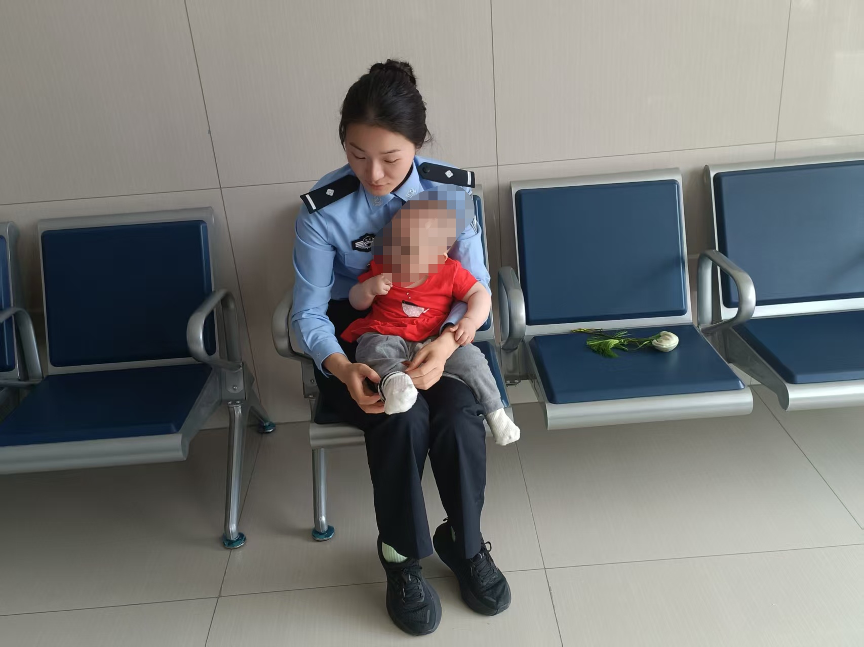 得知情况后,民警赶忙上前询问情况,只见坐在车后座的程女士面色苍白,额头渗出冷汗,座椅上还躺着一名一岁左右的婴儿。民警当即表示送其前往医院治疗,可程女士连连摆手,气若游丝地说:“犯了老毛病,并无大碍,休息一下即可好转。”见状,民警便协助司机将这名走路踉踉跄跄的程女士,小心翼翼地搀扶到大厅内歇息。