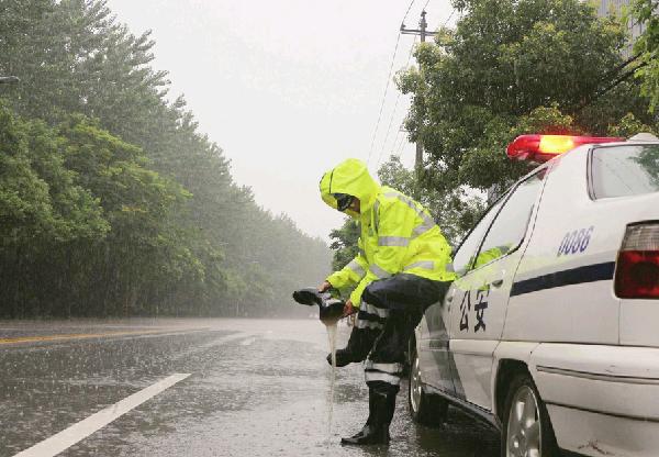 7月4日,瓢泼大雨造成湖北省黄石市下陆区多条道路积水严重。黄石市公安局交巡警支队下陆大队全警出动,冒雨在路面上维护道路交通。