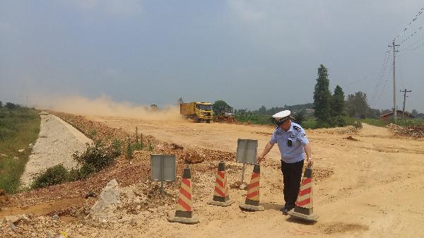 烈日中防汛大堤旁值守,确保防汛运输车辆畅通