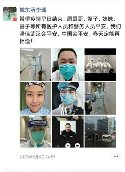 李璠直言,由于只能偶尔通过电话联系,且大家都是报喜不报忧,所以他也担心住在老家没有儿女陪伴的年迈父母,担心帮助带孩子、患有高血压和糖尿病的岳父,担心离危险最近的医生哥嫂和护士妹妹,也担心同为战友的妻子。“但身为老党员的父亲总是教导我们‘时刻准备着为党和人民作出牺牲’,自家难事靠家人齐心协力去克服,身为警察、身为医生,坚守岗位是天职。”