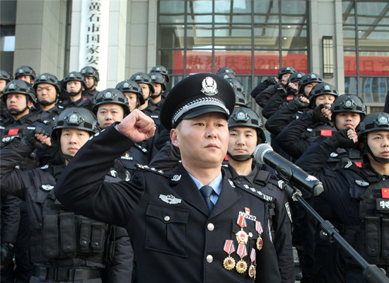 首个警察节,全国公安系统二级英雄模范赵兵带领民警代表在警旗下重温入警誓词。 通讯员 吴刚 摄.JPG