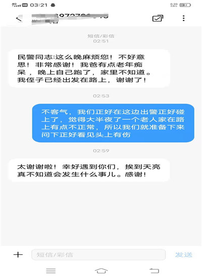 (通讯员 杨慧兰)“太谢谢啦!幸好遇到你们……感谢!”1月29日凌晨,黄石市阳新县公安局黄颡口派出所民辅警在出警途中,帮助一名患有老年病症的爹爹找到亲人。将老人交给亲属后,该老人在外工作的儿子特意向返程民警一行发信息致谢。